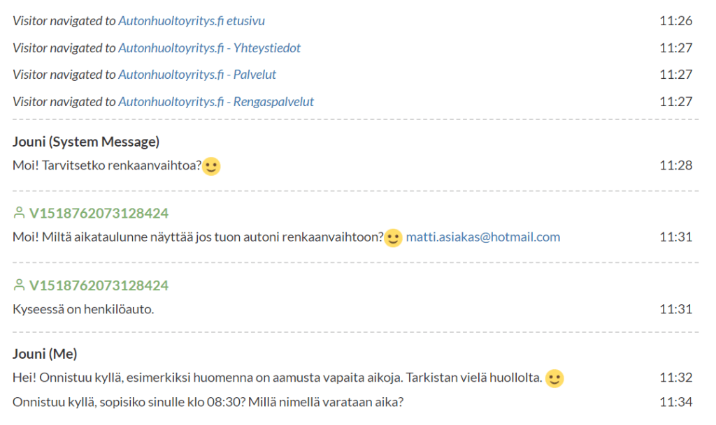 Kuva: Chatin kautta asian hoito saattaa olla monelle mieluisampaa kuin puhelimitse soittaminen esimerkiksi työaikana. Yllä Tawk.to ylläpitäjän näkymä chat-ketjusta. Ylläpitäjä näkee esimerkiksi millä sivulla asiakas paraikaa seikkailee sivustollasi.