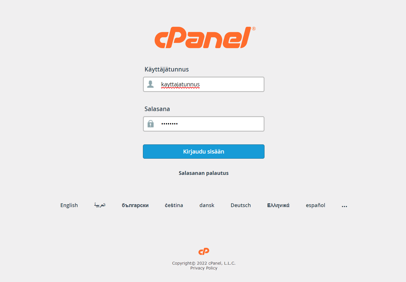 XetNETin asiakkaana voit kirjautua omaan cPanel-hallintatyökaluun kirjoittamalla nettiselaimeesi oman verkkotunnuksesi perään /cpanel esim. https://yritys.fi/cpanel/