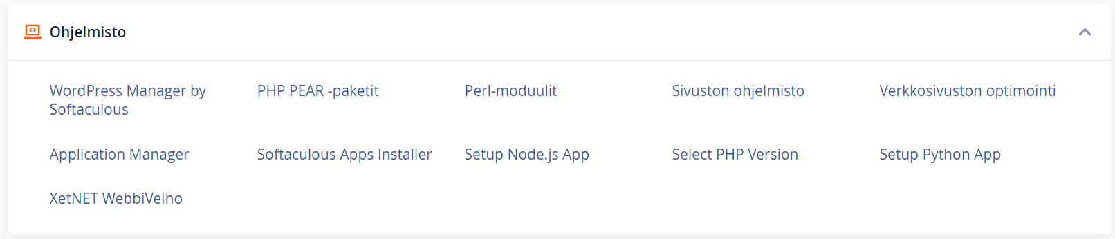 cPanelin kautta asennat webhotelliisi nopeasti erilaisia sovelluksia ja hallinnoit asennuksien asetuksia. Esimerkiksi ”Softaculous Apps Installer” tarjoaa reilusti yli 300 erilaista sovellusta, jotka voit asentaa webhotelliisi. WordPressin asentaminen esimerkiksi onnistuu vain muutamassa minuutissa sen avulla.