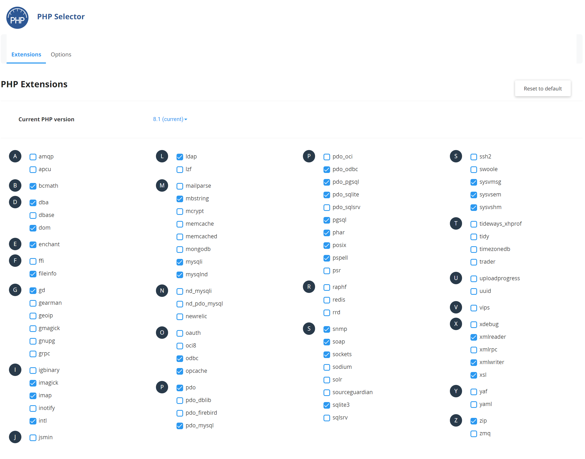 Kuva yllä: ”Select PHP Version” näkymästä voit määritellä PHP-ohjelmointikielen version, jolla webhotellisi sovelluksia suoritetaan. Tarkista webhotelliisi asennetun sovelluksen dokumentaatiosta suositeltu PHP-versio ja mahdolliset lisäasetukset, joita kannattaa kytkeä päälle. Kovin vanhaa PHP-versiota ei kannata käyttää, sillä se voi sisältää tietoturvariskin tuen päätyttyä. Voit saman työkalun avulla määritellä PHP:n lisäasetukset. Esimerkiksi ”OPcache” asetuksen kytkeminen päälle nopeuttaa PHP-käskyjen suorittamista ja vähentää käskyjen vaatiman muistin tarvetta.