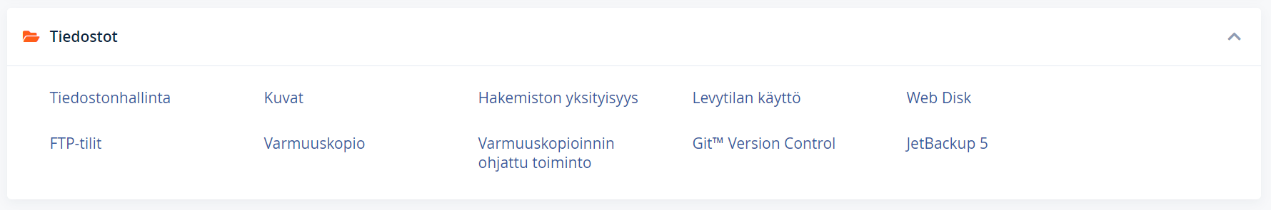 • ”Varmuuskopio” näkymästä voit ladata kokonaisen kotihakemiston sekä tietokantojen varmuuskopiot tietokoneellesi.