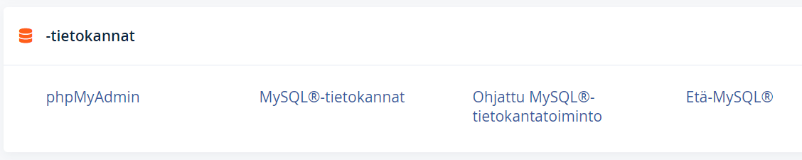 Monet sovellukset, kuten WordPress julkaisujärjestelmä esimerkiksi, tarvitsee tietokannan toimiakseen. Voit halutessasi hallinnoida tietokantoja manuaalisesti cPanelin ”Tietokannat” sivun alta.