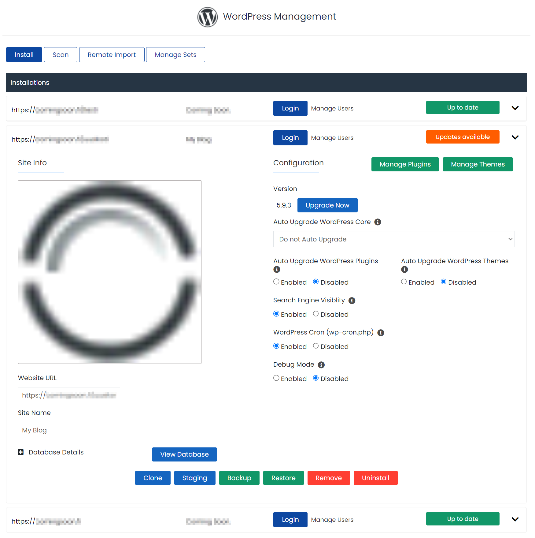 Kuva yllä: WordPress Manager by Softaculous tarjoaa cPanelin kautta tehtäviä lisäasetuksia WordPressin hallintaan. Näitä ovat mm. kloonaus, staging-ympäristö, varmuuskopiointi ja palautus sekä asennuksen poisto.