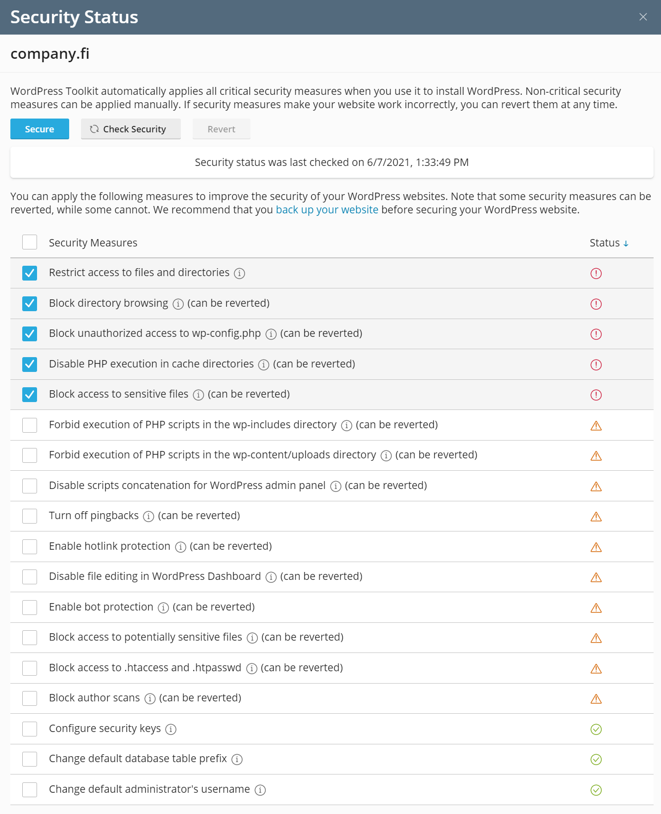 Picture above: The protection of a WordPress website is strengthened with only a few clicks. It is not necessary to use all protections, especially if you know that you will not need all features, or you have solved your data security problems in another way. For example, disconnecting Pingback requests protects your website against distributed denial-of-service (DDoS) attacks for Pingback requests. Such attacks may cause your website to crash. The screenshot above is from the protection settings of a WordPress website installed with default settings. As you can see, there are many points in a WordPress installation made with its default settings which are worth protecting with the WordPress Toolkit.