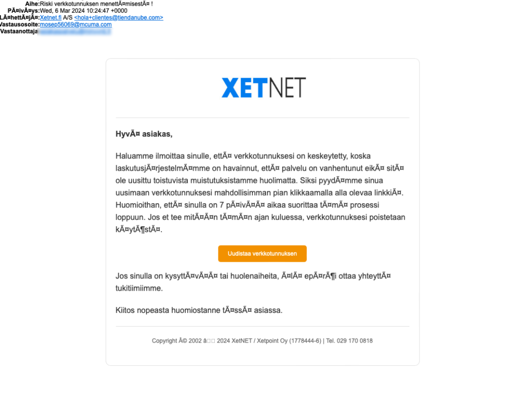 Nimissämme on lähetetty huijausviestejjä koskien verkkotunnusten uusintaa. Viestien lähettäjänä on Xetnet.fi A/S ja lähettäjänosoite on jotain muuta kuin @xetnet.fi sähköpostiosoite. Viestit ovat huijausviestejä ja niissä olevaa uusintalinkkiä ei kannata missään tapauksessa klikata tai syöttää sinne tietojansa.