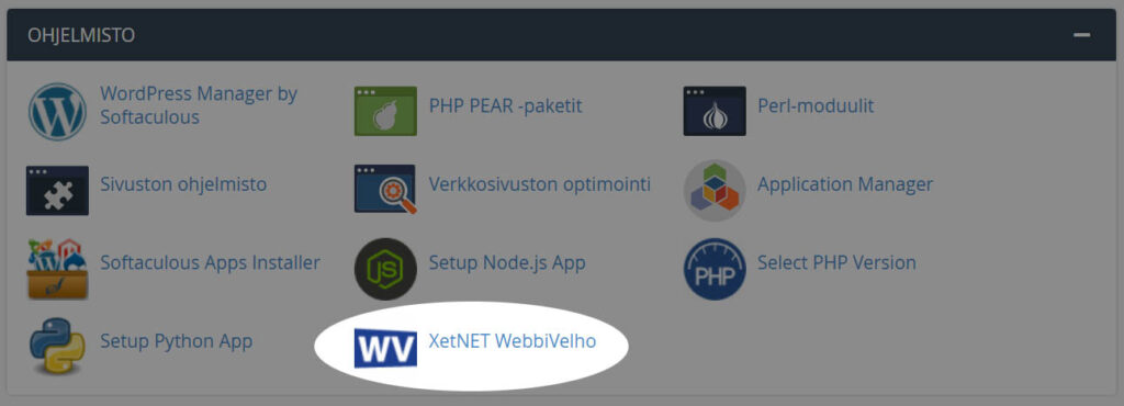 Rullaa alaspäin ”Ohjelmisto” otsikolla varustettuun kohtaan, josta löydät ”XetNET WebbiVelho” sovelluksen. Klikkaa sitä ja pääset ottamaan käyttöön kotisivukone WebbiVelhon.